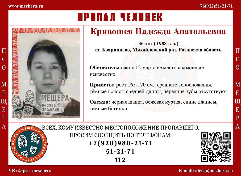 В Михайловском районе Рязанской области идут поиски 36-летней женщины. Надежда Кривошея пропала 12 марта 2024 года. Волонтёры поисково-спасательного отряда «Мещера» обратились к жителям с просьбой о помощи в поисках.